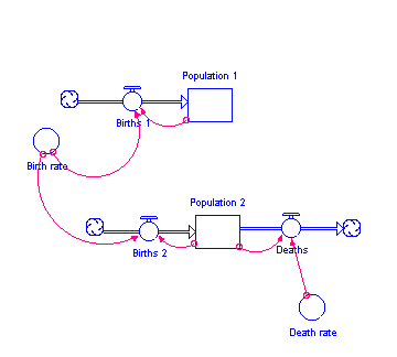 Population 1 was calculated with the assumption that no rabbit dies, whereas Population 2 was calculated with more realistic assumption that no rabbit lives forever.
